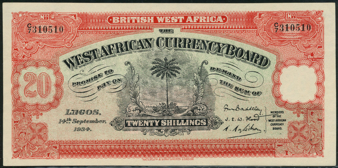 (x) West African Currency Board, 20 shillings, 14 September 1934, serial number C/7 310510, black text on red, palm tree at centre, value at left and right, Badderley, Flood and Wilson and Williams signatures low right, reverse Arabic text