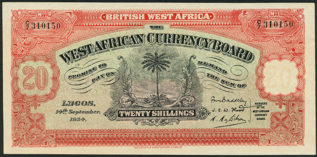 (x) West African Currency Board, 20 shillings, 14 September 1934, serial number C/7 310150, black text on red, palm tree at centre, value at left and right, Badderley, Flood and Wilson and Williams signatures low right, reverse Arabic text