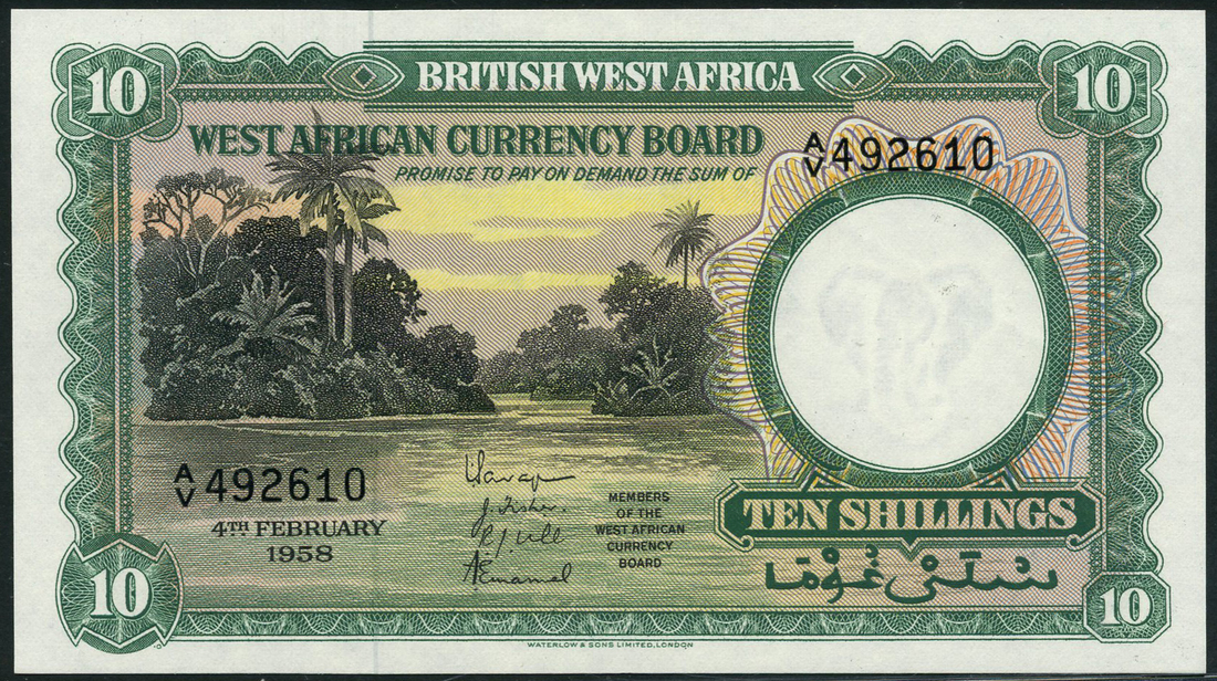 (x) West African Currency Board, 10 shillings, 4 February 1958, serial number AV 492610, green and red-brown, the Niger river left centre, value at each corner, signatures of Savage, Fisher, Vile and Emmanuel, reverse green and white, groundnut harvesting