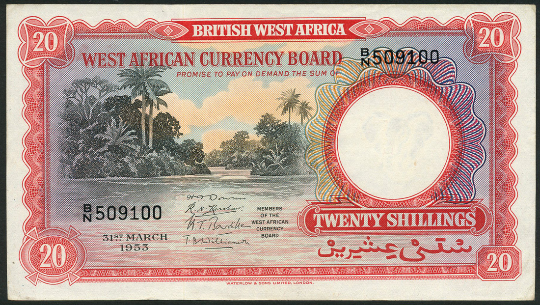 (x) West African Currency Board, 20 shillings, 31 March 1953, serial number B/N 509100, black and red and pale lilac, river Niger at left, Downie, Kershaw, Bourdillon and Williamson signatures, reverse, red and white, cacao pod harvesting