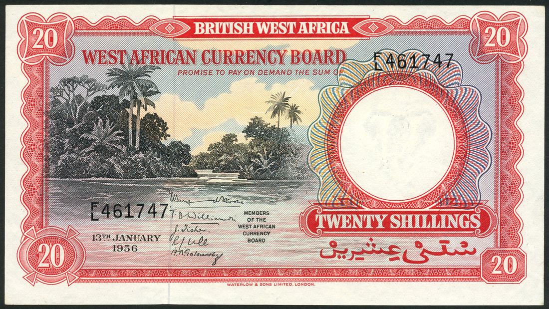 (x) West African Currency Board, 20 shillings, 13 January 1956, serial number F/L 461747, black and red and pale lilac, river Niger at left, Stooke, Williamson, Fisher, Vile and Vernon signatures, reverse, red and white, cacao pod harvesting