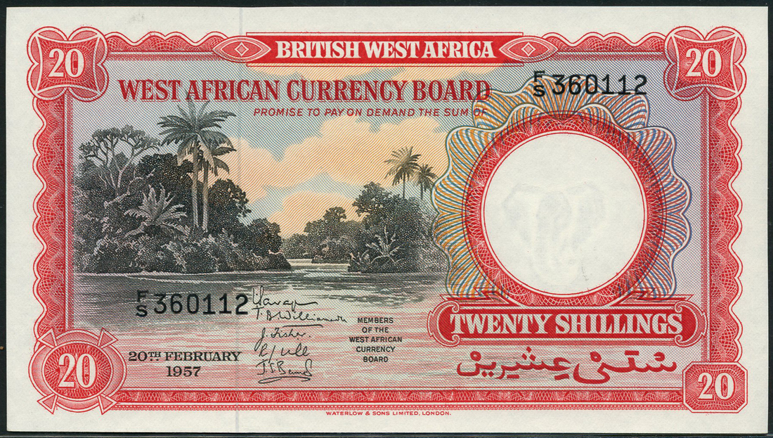 (x) West African Currency Board, 20 shillings (2), 20 February 1957, serial number F/S 360112/113 black and red and pale lilac, river Niger at left, Savage, Williamson, Fisher, Vile and Bennett signatures, reverse, red and white, cacao pod harvesting