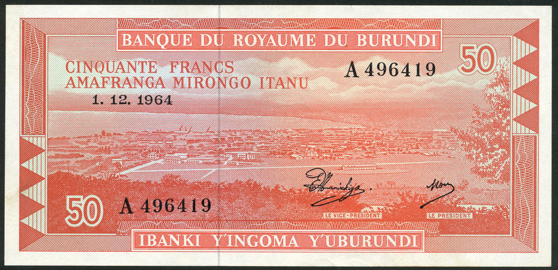 (x) Banque du Royaume du Burundi, 10 francs, 1965, prefix M, brown and pink, Ankole-Watusi cattle, also 50 francs, 1964, prefix A, red, Bujumbura at centre