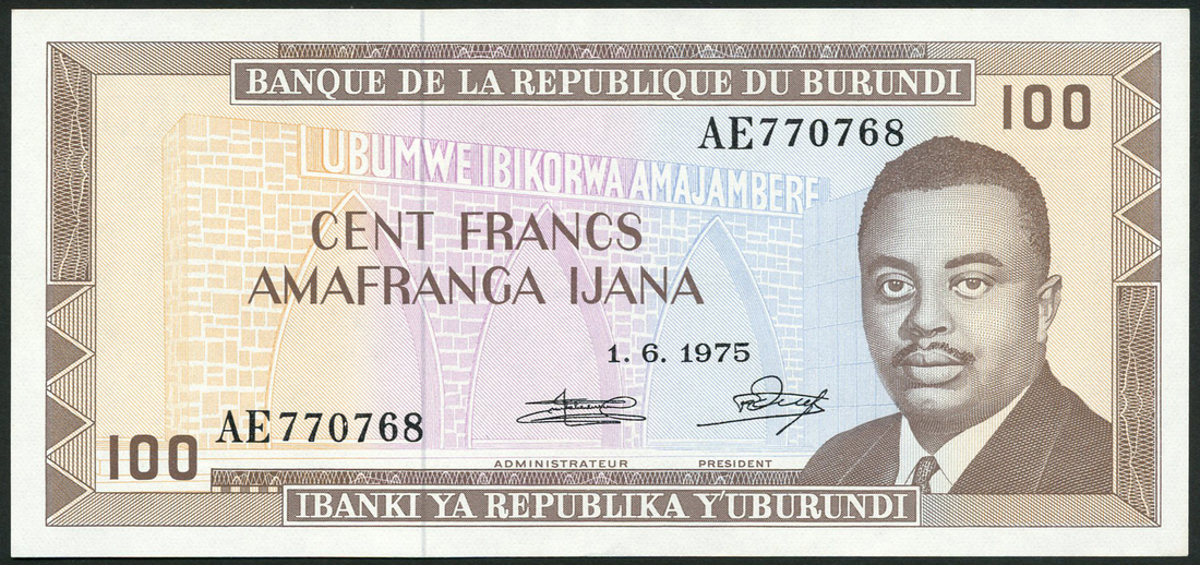 (x) Banque de la Republique du Burundi, 10 francs (2), 1968,1970, red, green and blue, Place de la Revolution monument at centre, 20 francs, 1973, violet and green, dancing warrior, 100 francs, 1975, brown, Prince Louis Rwagasore at right