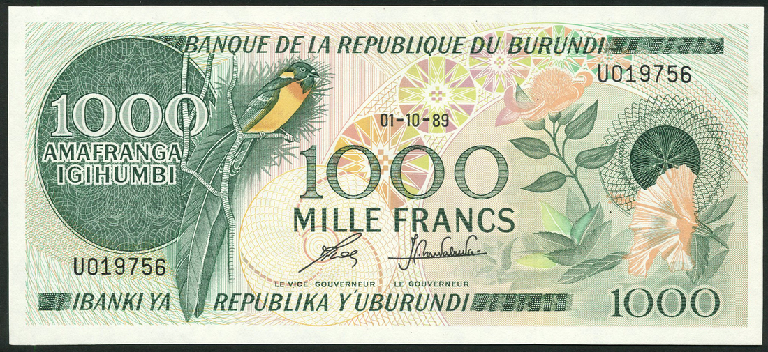 (x) Banque de la Republique du Burundi, 20 francs (2), 1977,2007, red, 50 francs (6), 1977,1979,1988,1989,1991,1993, brown,100 francs (2), 1977,1993, violet, 500 francs (2), 1986,1988, blue,1000 francs (2), 1988,1989, green