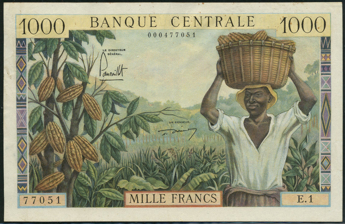 (x) Banque Centrale, Cameroun, 1000 francs, ND (1962), serial number E 177051, green and multicolour, cacao tree at left, man carrying wicker basket of cacao pods at right, signatures of Panouillot and Duoudei, reverse, coffee bean harvesting scene, mountains in background