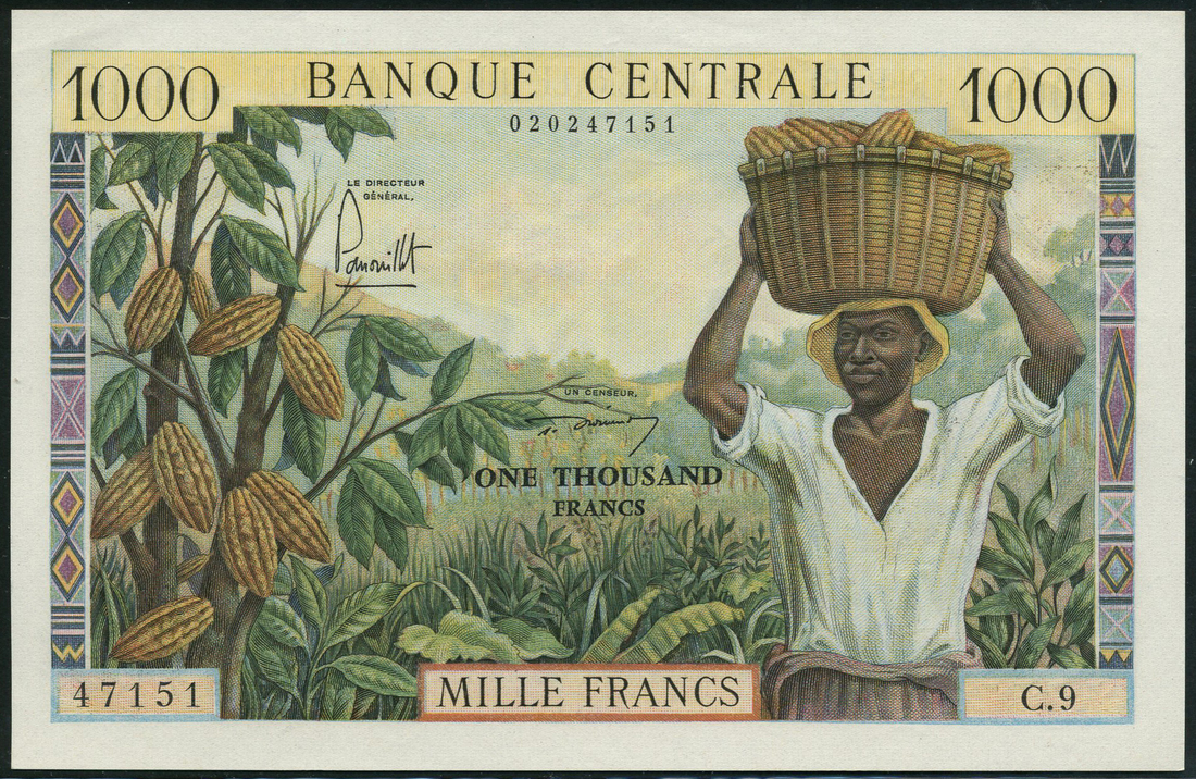 (x) Banque Centrale, Cameroun, 1000 francs, ND (1962), serial number C9 47151, green and multicoloured, man and basket of Cacao pods at right, value top left and right, signatures of Panoiullot and Duoudei at centre, reverse coffee bean harvesting, text top centre reads REPUBLIQUE FEDERALE DU CAMEROUN
