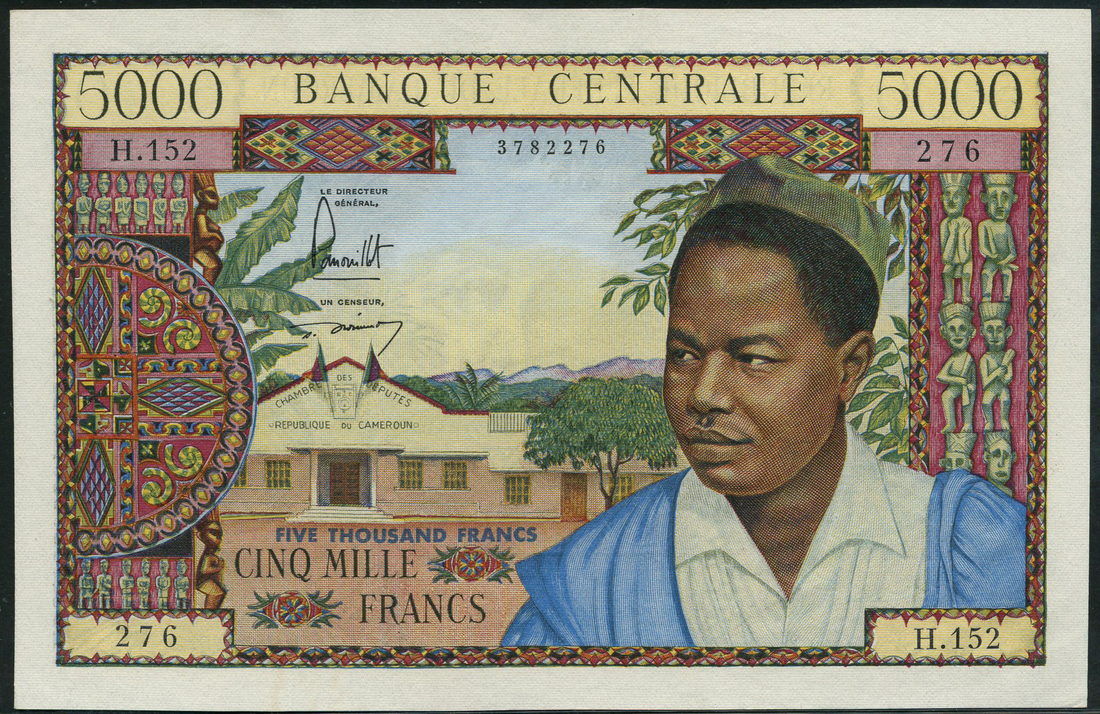 (x) Banque Centrale, Cameroun, 5000 francs, ND (1962), serial number H 152276, purple and multicoloured, President Ammadou Ahidjo at right, the 'Chambre des Deputes' at left, value top left and right, signatures of Panouillot and Duoudei at left, reverse purple and multicoloured, an intricate floral design with a logging scene at centre, text top centre reads REPUBLIQUE FEDERALE DU CAMEROUN