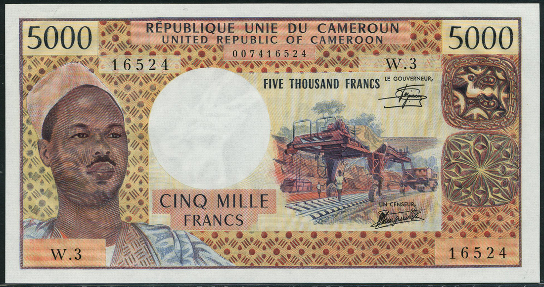 (x) Banque des Etats de l'Afrique Centrale, Republique Unie du Cameroun, 5000 francs, ND (1978), serial number W3 16254, yellow-brown and multicoloured, President Ahmadou Ahidjo at left, railroad crane at right centre, carved bird at right, value top left and right, signatures of Oye-Mbe and Kamgueu, reverse yellow-brown, mining building and Minaret at centre, wooden carving at left and right