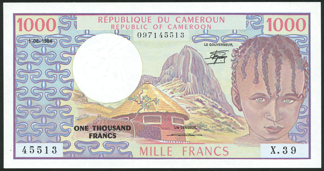 (x) Banque des Etats de l'Afrique Centrale, Republique du Cameroun, 1000 francs, 1 June 1984, serial number X39 45513, blue and multicoloured, girl at right, hut below rocky escarpment, value top left and right, signatures of Oye-Mbe and Tchepannou, reverse blue, mining excavation digger at centre, wooden carving at left and right