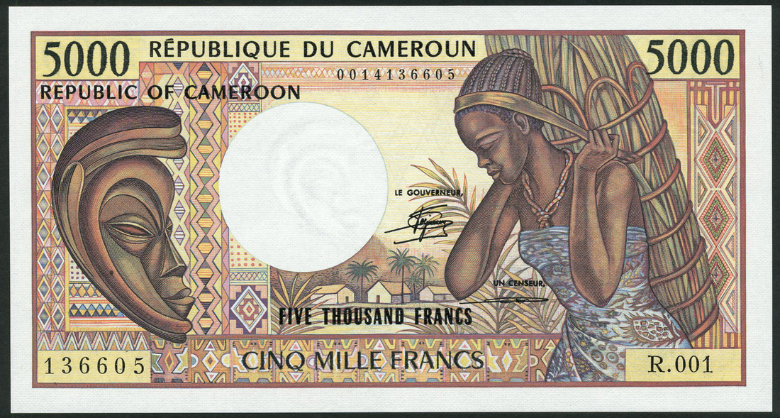 (x) Banque des Etats de l'Afrique Centrale, Republique du Cameroun, 5000 francs, ND (1984), serial number R001 136605, brown and yellow and multicoloured, woman with basket of fronds at right, huts at centre, wooden mask at left, value top left and right, signatures of Oye-Mbe and Tchepannou at centre, reverse yellow-brown and multicoloured, tractor and musical instrument at left, mining bucket at right,