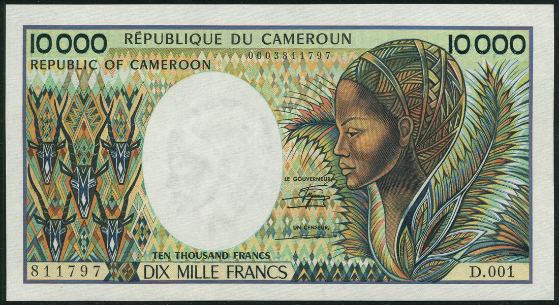 (x) Banque des Etats de l'Afrique Centrale, Republique du Cameroun, 10000 francs, ND (1984), serial number D001 811797, green and multicoloured, woman at right with palm fronds, five antelope heads at left, value top left and right, signatures of Oye-Mbe and Tchepannou at centre, reverse pale green and multicoloured, people loading a truck with fruit, value top left and right