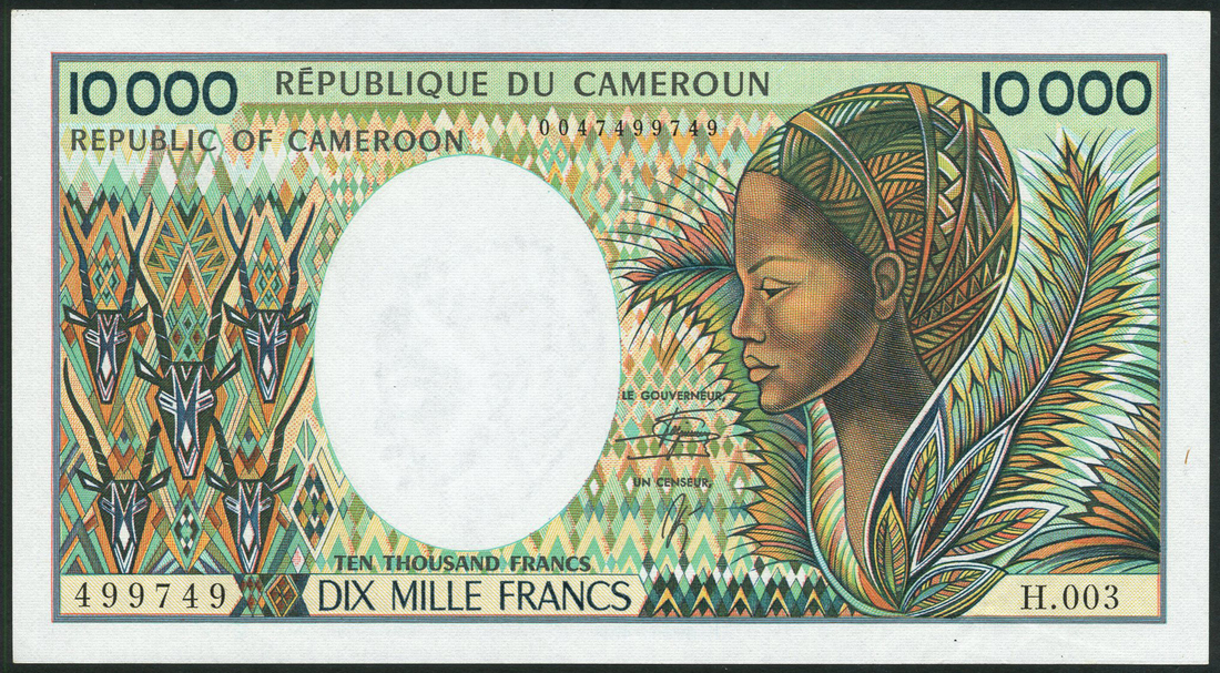 (x) Banque des Etats de l'Afrique Centrale, Republique du Cameroun, 10000 francs, ND (1990), serial number H003 499749, green and multicoloured, woman at right with palm fronds, five antelope heads at left, value top left and right, signatures of Oye-Mbe and Dang at centre, reverse pale green and multicoloured, people loading a truck with fruit, value top left and right