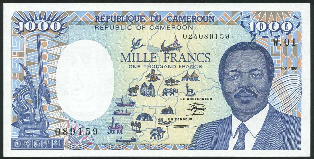 (x) Banque des Etats de l'Afrique Centrale, Republique du Cameroun, 500 francs (2), 1985,1990, prefixes C02,X03, orange, carvings, Oye-Mbe and Tchepannou and Oye-Mbe and Dang signatures, 1000 francs (4), 1985,1986,1990,1992, prefixes W,O,D,U, blue, Paul Biya at right, signatures of Oye-Mbe and Tchepannou, Oye-Mbe and Dand and Mamelpot and Mebara
