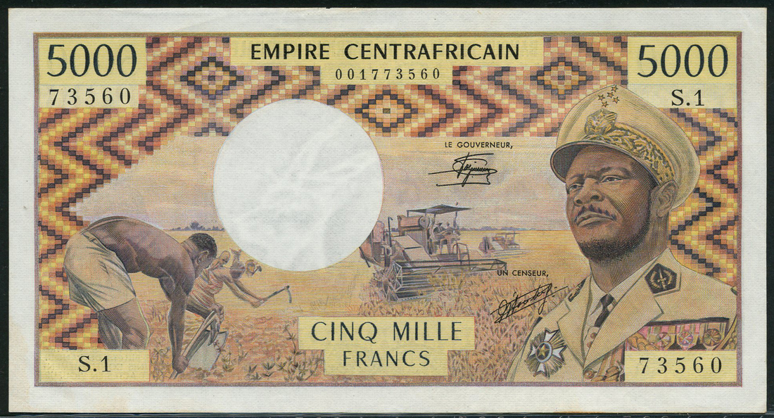 (x) Banque des Etats de L'Afrique Centrale, Central African Empire, 5000 Francs, ND (1979 ), serial number S.1 73560, yellow-brown and multicoloured, combine harvester and field workers, President Jean-Bedel Bokassa at right, value in blue top left and right, signatures of Oye-Mba and Emane at right, reverse pink-brown, mining machinery at centre, Minaret at right, carving at left and right, value top left and right