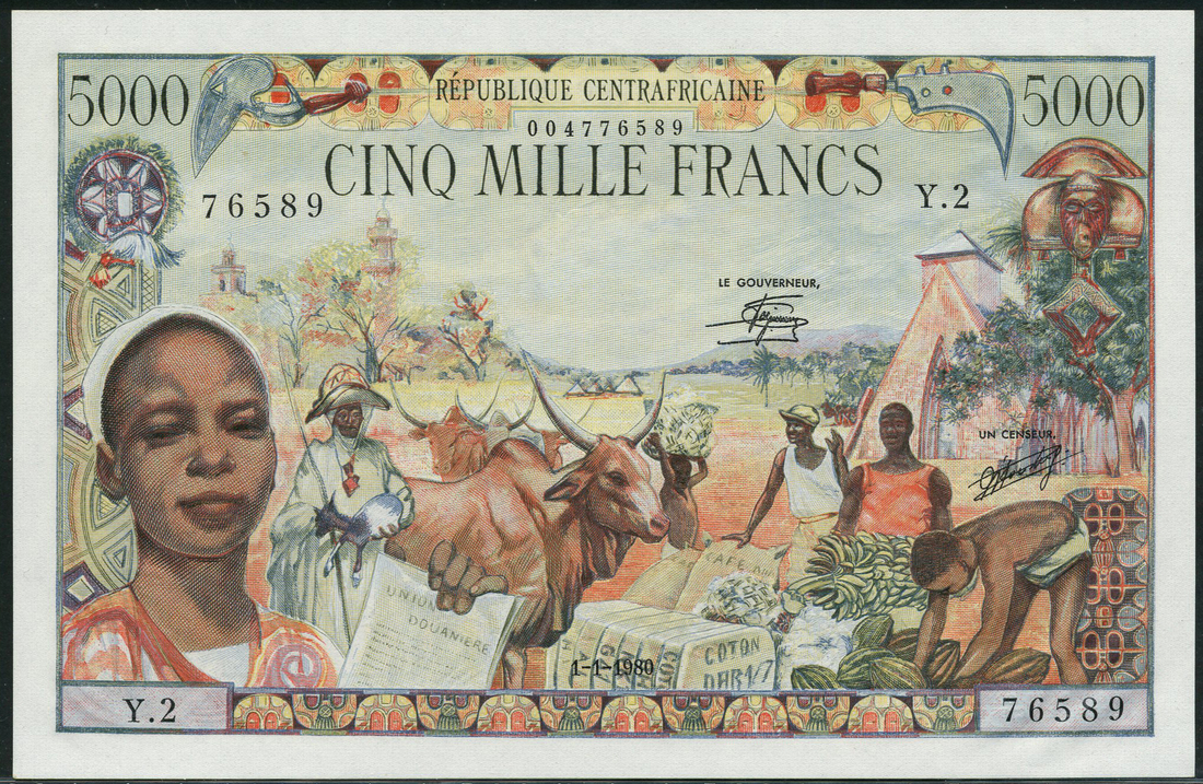 (x) Banque Centrale des Etats de L'Afrique Centrale, Central African Republic, 5000 Francs, 1 January 1980, serial number Y2 76589, green, red and multicoloured, boy at left holding newspaper 'UNION DOUANIERE, Saint Anne's Basilica in Brazzaville, cattle and village scene at centre, value top left and right, signatures of Oye-Mba and Ntoutoume Emane, reverse multicoloured, man with pipe at right, tractor, train and planes at centre, symbols of progress