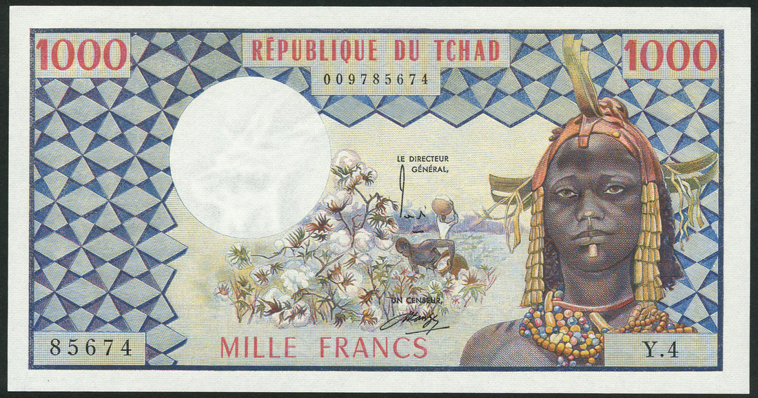 (x) Banque des Etats de l'Afrique Centrale, Republique du Tchad, 500 francs, ND (1974), serial number L3 10636, red-brown and pale yellow, woman at left, crowned cranes in field, value top left and right, signatures of Joudiou and Emane, reverse red, students at centre, wooden mask at left and carved figure at right, value top left and right, also 1000 francs (2), ND (1973-),1978, prefixes Y4,Q9, blue and multicoloured, cotton picking, man at right, signatures of Joudiou and Ntang and Oye-Mba and Kamgueu, reverse blue, mining excavator, carving at left and right