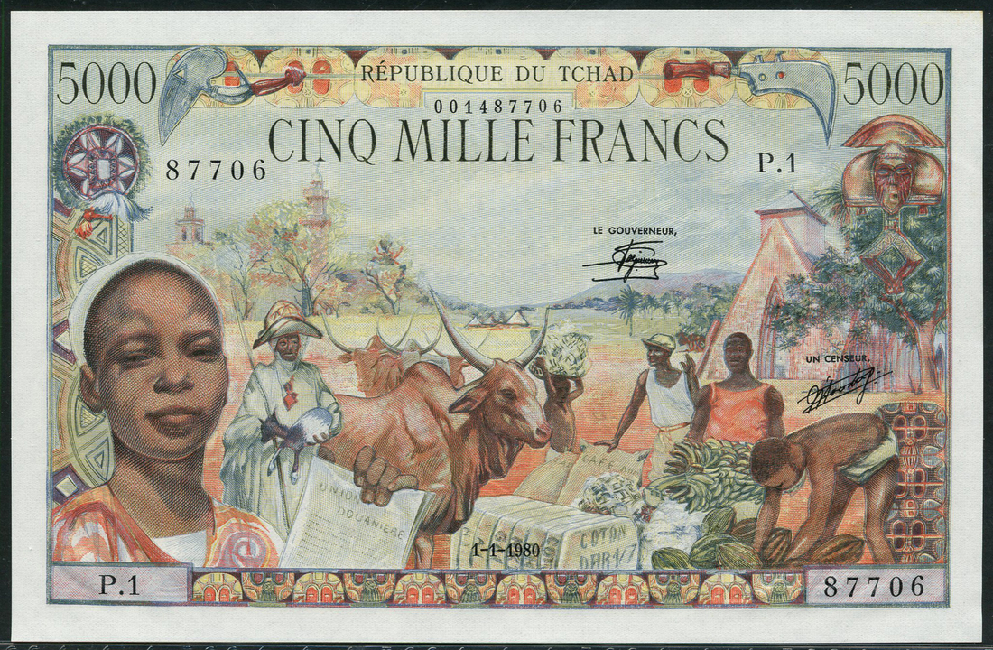 (x) Banque des Etats de l'Afrique Centrale, Republique du Tchad, 5000 francs, 1 January 1980, serial number P1 87706, multicoloured, young boy with newspaper 'UNION DOUANIERE' headline, market scene, Saint Anne's Basilica in Brazzaville at right, very ornate background detail, signatures of Oye-Mba and Ntoutome Emane at centre, reverse multicoloured, man with pipe at right, allegorical scene of transport and progress at centre