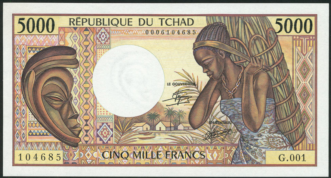 (x) Banque des Etats de l'Afrique Centrale, Republique du Tchad, 500 francs (3), 1986,1987,1990, prefixes L,Z,C, pale pink-red, wooden figure and bowl at centre, signatures of Oye-Mba-Kamgueu,Oye-Mba-Dang and Mamalepot and Mebara, also 1000 francs, 1985, serial number 063170, pale blue and violet, map at centre, Oye-Mba and Dang signatures, also 5000 francs, ND (1984), prefix L.02, multicolour, woman with basket of fronds at right