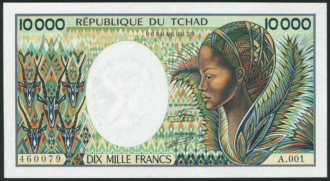 (x) Banque des Etats de l'Afrique Centrale, Republique du Tchad, 10000 francs (2), ND (1984), prefixes D001 and A001, green and multicoloured, woman with palm fronds around at right, five antelope heads at left, value top left and right, ornate background detail, signatures of Oye-Mba and Ntoutoume Emane low centre, reverse multicoloured, people loading fruit onto a truck, fruit at right