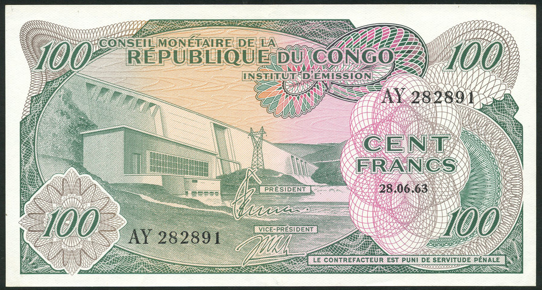 (x) Democratic Republic of Congo, 100 francs (2), June 1963, prefixes AD,AY, green and pale orange and lilac, the Ruzizi hydroelectric dam at left centre, value at right and at each corner, Jenssen and Anyenga signatures low centre, reverse green and pink, a bucket chain excavator