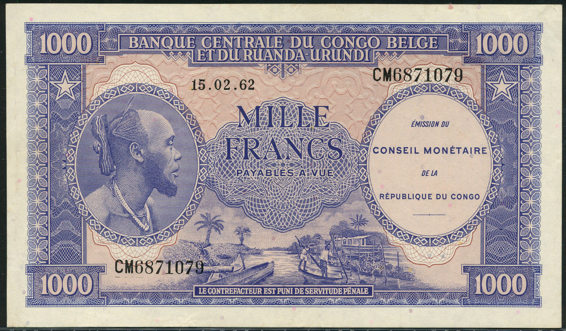 (x) Democratic Republic of Congo, 1000 francs, 15 February 1962, serial number CM 6871079, blue and pale pink-brown, a Moliro man at left, river with palms and pirogue boats and buildings, 'EMISSION DUCONSEIL MONETAIRE DE LA REPUBLIQUE DU CONGO printed at right, reverse pink-brown, waterbuck drinking at a river, value at right and at left