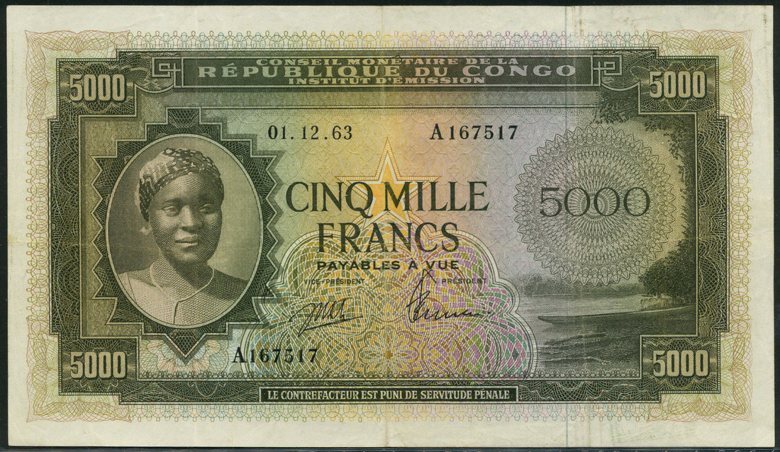 (x) Democratic Republic of Congo, 5000 francs, 1 December 1963, serial number A 167517, grey-green and pale orange, woman with head scarf at left, river at right, value at centre and at left and right, Jenssen and Anyenga signatures low centre, reverse blue and white, canoe and oarsmen at centre, value at left and right