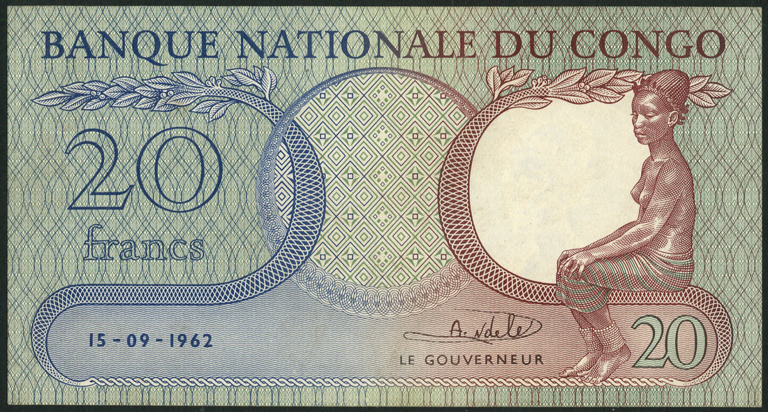 (x) Banque Nationale du Congo, 20 francs (4), 15 March/June/July/September 1962, prefixes Q,Z,EA,XA, green, mauve and brown, woman seated at right, value at left, Albert Mbamu signature low centre, reverse mauve, blue and green, tree at centre