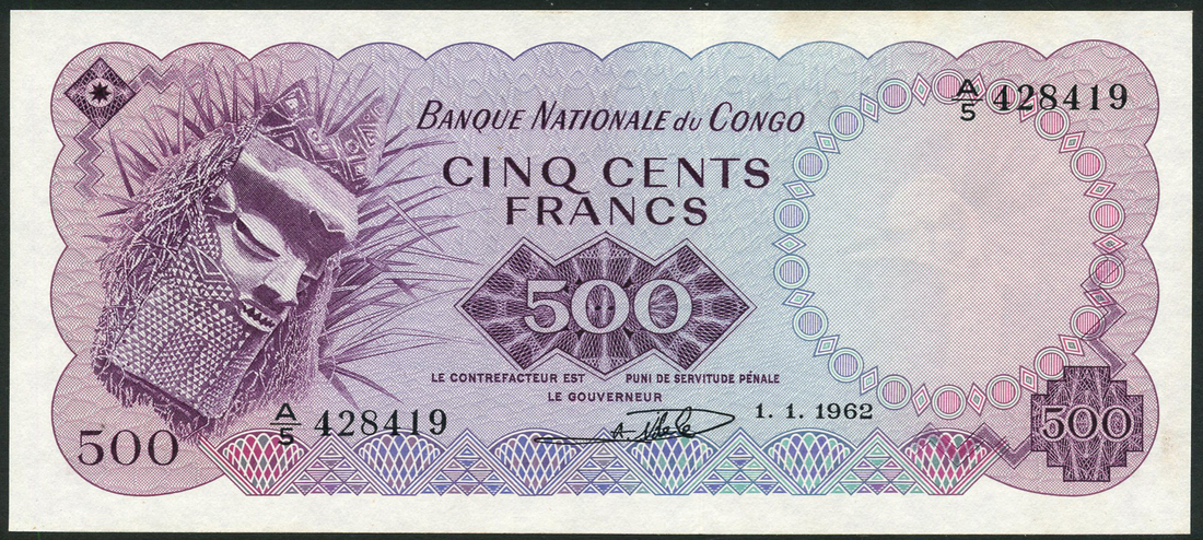 (x) Banque Nationale du Congo, 500 francs, 1 January 1962, serial number A/5 428419, purple, tribal mask at left, value at centre and low left and right, signature of Albert Mbamu low centre, reverse purple, the Palais de la Nation in Kinshasa low centre
