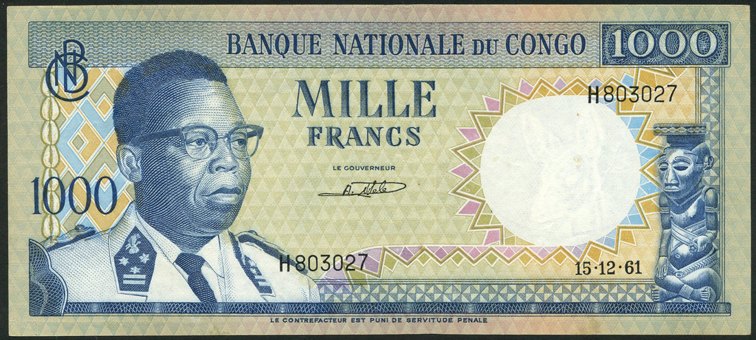 (x) Banque Nationale du Congo, 1000 francs (2), 15 December 1961, 1 August 1964, prefixes H,AA, blue, pale green and pale orange, President Joseph Kasa-Vubu at left, carver figure low right, value at centre, left and right, bank initials top left, signature of Albert Mbamu at centre, reverse blue and pale orange-yellow, the Palais de la Nation in Kinshasa low centre