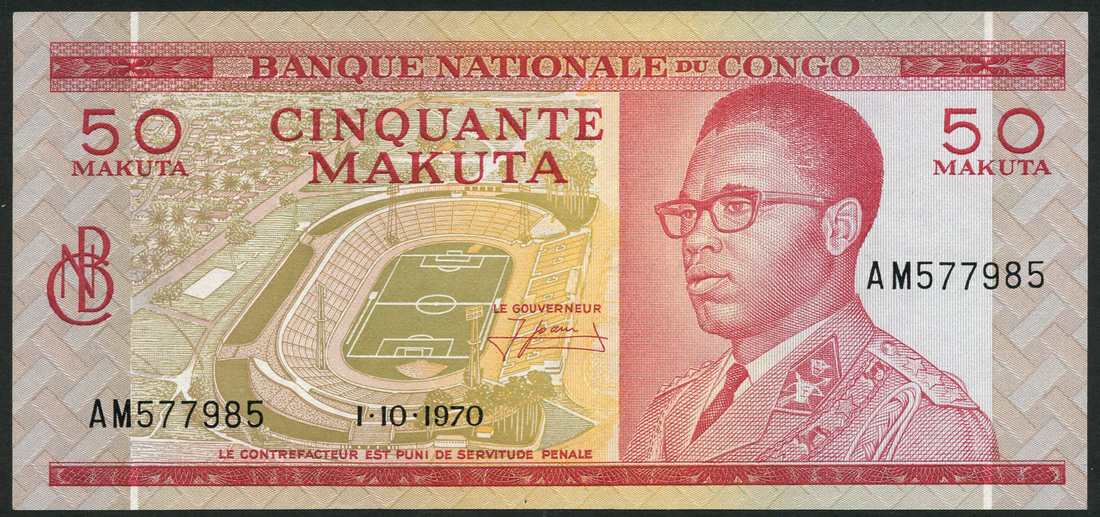 (x) Banque Nationale du Congo, 20 makuta, 1 October 1970, prefix AJ, brown and brown-green, Lumumba at right, crowd with flag at centre and 50 makuta, 1 October 1970, prefix AM, red and green and pale orange, Mobutu Sese Seko at right, Stade Tata Raphael at left, both signature of Albert Mbamu at centre