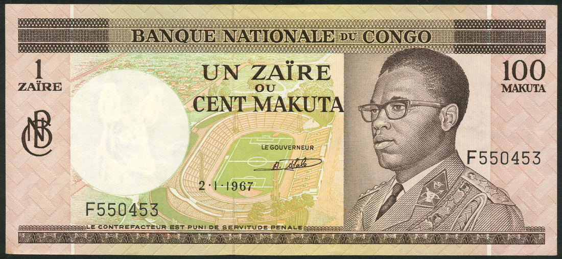 (x) Banque Nationale du Congo, 1 zaire, 2 January 1967, serial number F 550453, brown and pink and green, Mobutu Sese Seko at right, Stade Tata Raphael at left, signature of Albert Mbamu at centre, reverse brown and green, Mobutu and crowd