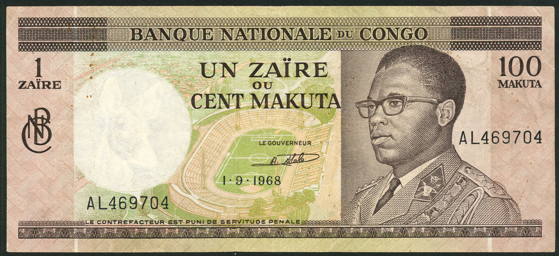 (x) Banque Nationale du Congo, 1 zaire (4), 24 November 1967, 1 September 1968, 21 January 1970, 1 October 1970 (2), prefixes AF,AL,BT,BD, brown and pink and green, Mobutu Sese Seko at right, Stade Tata Raphael at left, all signature of Albert Mbamu at centre except the last 1970 which has Jules N'Bagui signature, reverse brown and green,