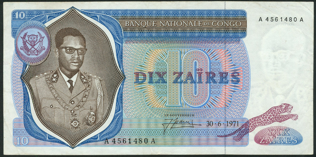 (x) Banque Nationale du Congo, 10 zaires, 30 June 1971, serial number A 4561480 A, blue and multicoloured, Mobutu Sese Seko at right, arms top left, Jules N'Bagui signature low centre, reverse blue and multicoloured, arms at left centre, value right centre, bank initials low left