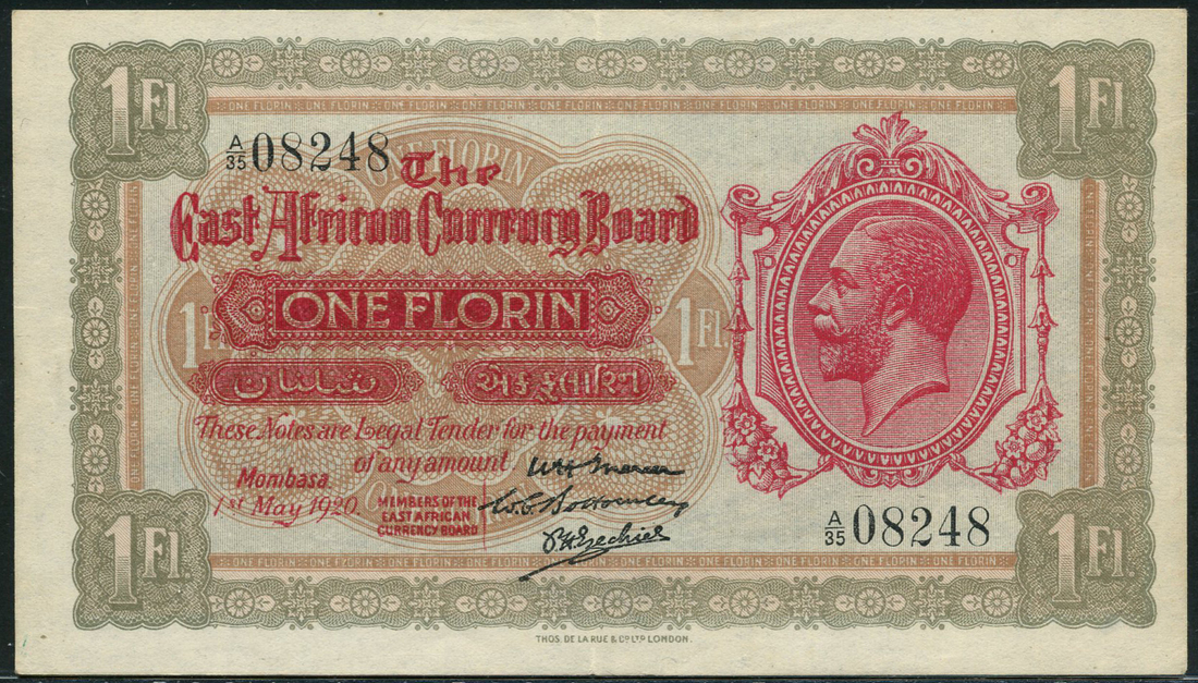 (x) East Africa Currency Board, 1 florin, 1 May 1920, serial number A/25 08248, red and olive-brown, head of George V at right, value at left and at each corner, Mercer, Bottomley and Ezechiel signatures, reverse blue, hippopotamus at centre