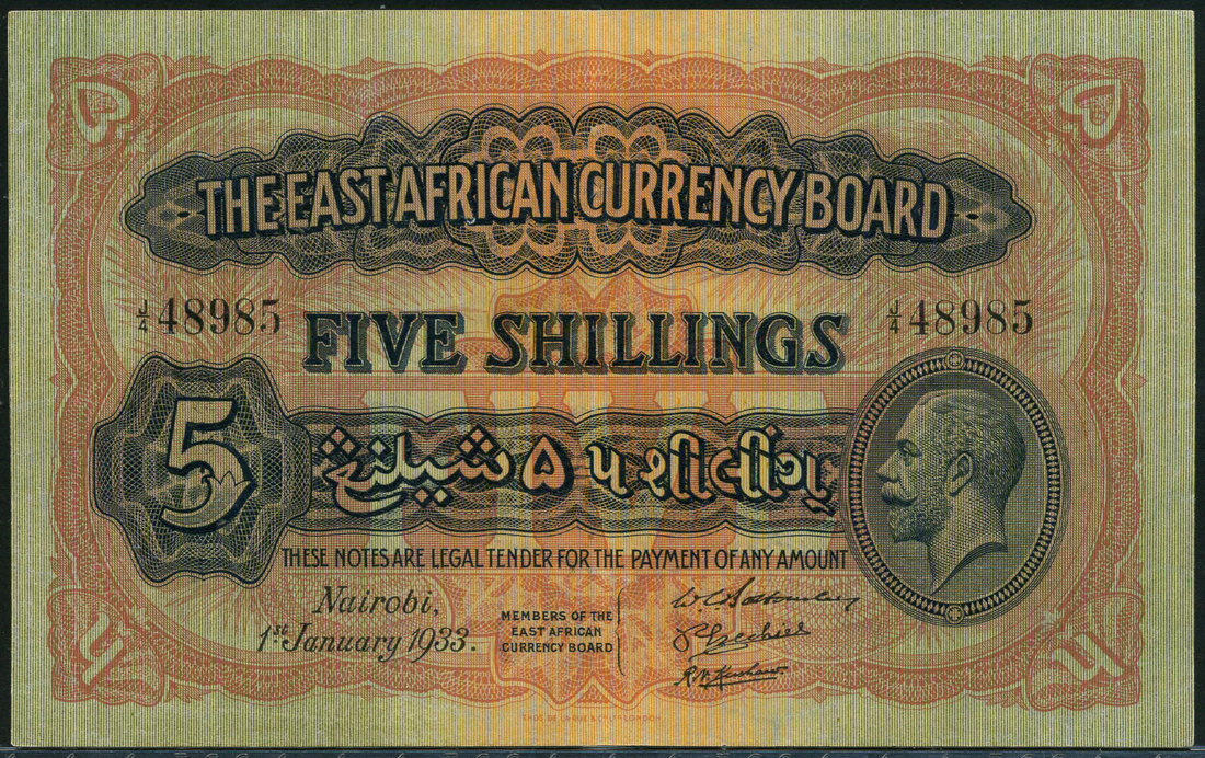 (x) East African Currency Board, 5 shillings, 1 January 1933, serial number J/4 48495, blue, black and pale orange-brown, head of George V at right, value at centre and at each corner, Bottomley and Ezechiel and Kershaw signatures, reverse orange-brown, a lion at centre