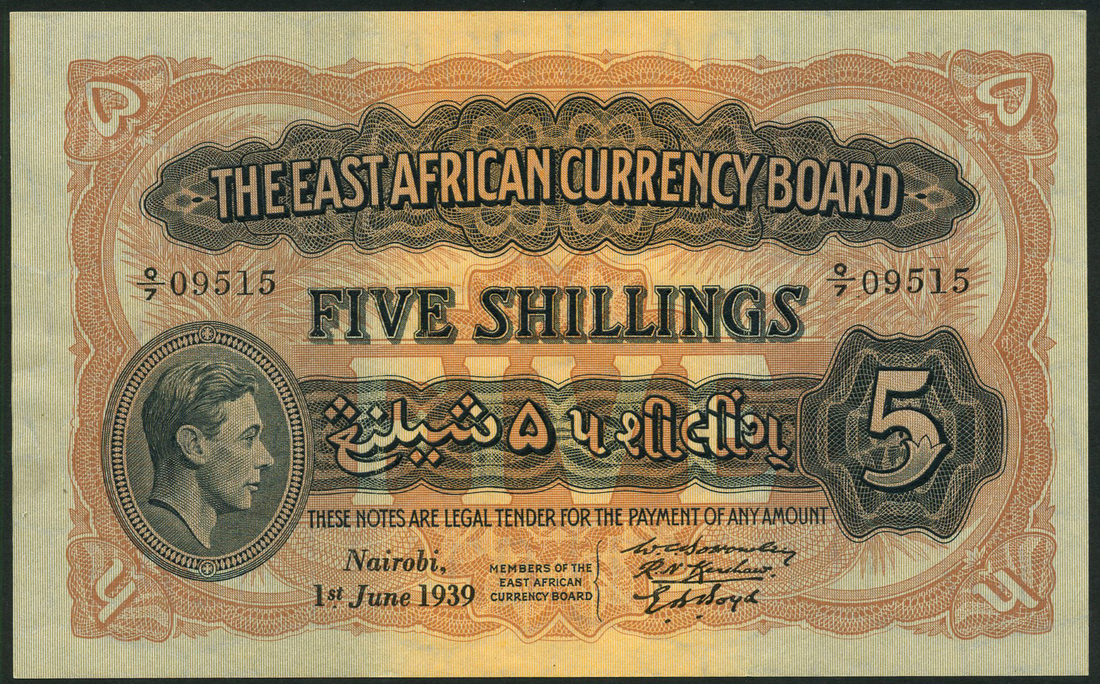 (x) East African Currency Board, 5 shillings, 1 June 1939, serial number Q/7 09515, blue, black on yellow-orange, head of George VI at right, value at centre and at each corner, Bottomley, Kershaw and Boyd signatures, reverse brown, lion at centre