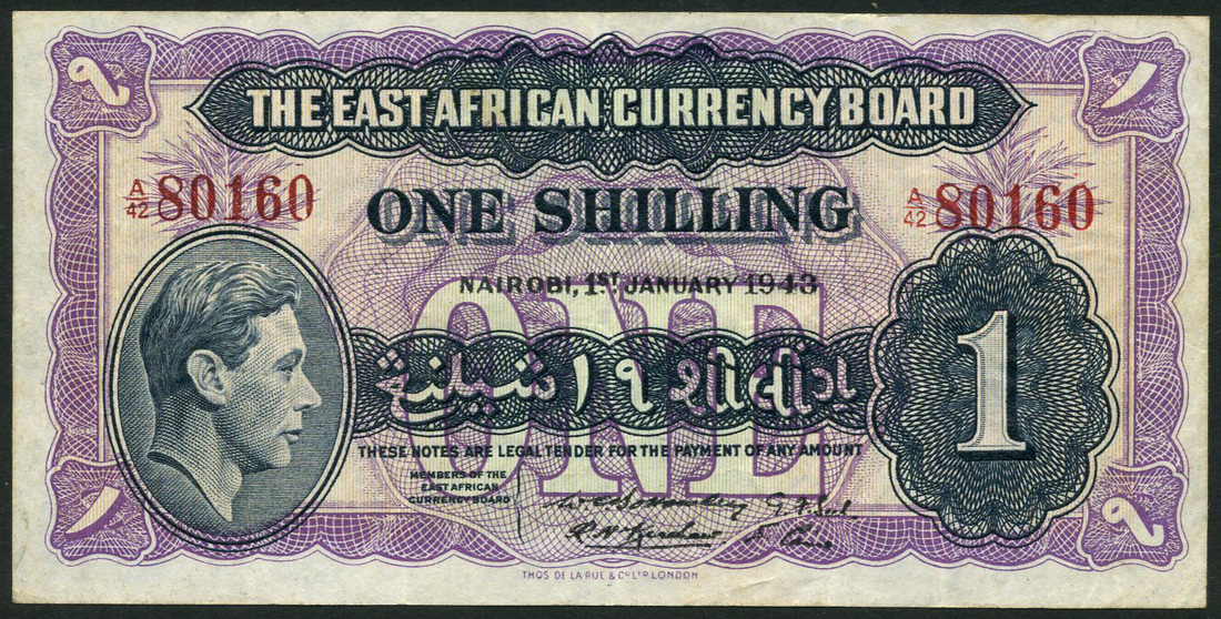 (x) East African Currency Board, 1 shilling, 1 January 1943, prefixes A/42,A/45, black on lilac-purple, head of George VI low left, value low right, Bottomley, Kershaw, Seel and Caine signatures, reverse lilac-purple, lion at centre, value at left and right