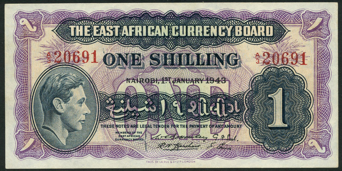 (x) East African Currency Board, 1 shilling, 1 January 1943, serial number A/3 20691, black on lilac-purple, head of George VI low left, value low right, Bottomley, Kershaw, Seel and Caine signatures, reverse lilac-purple, lion at centre, value at left and right