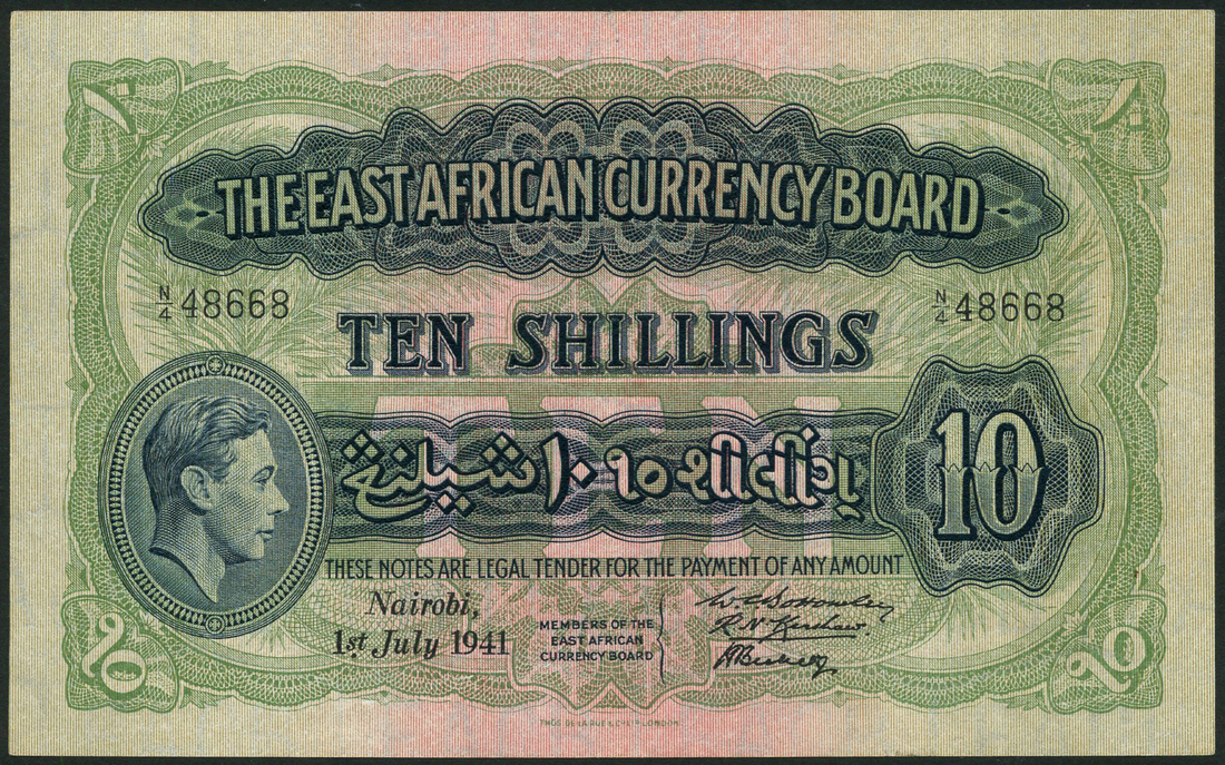 (x) East African Currency Board, 10 shillings, 1 July 1941, serial number N/4 48668, blue-black on green, George VI at low left, value at centre, at right and at each corner, Bottomley, Kershaw and Beckett signatures, reverse green, lion at centre