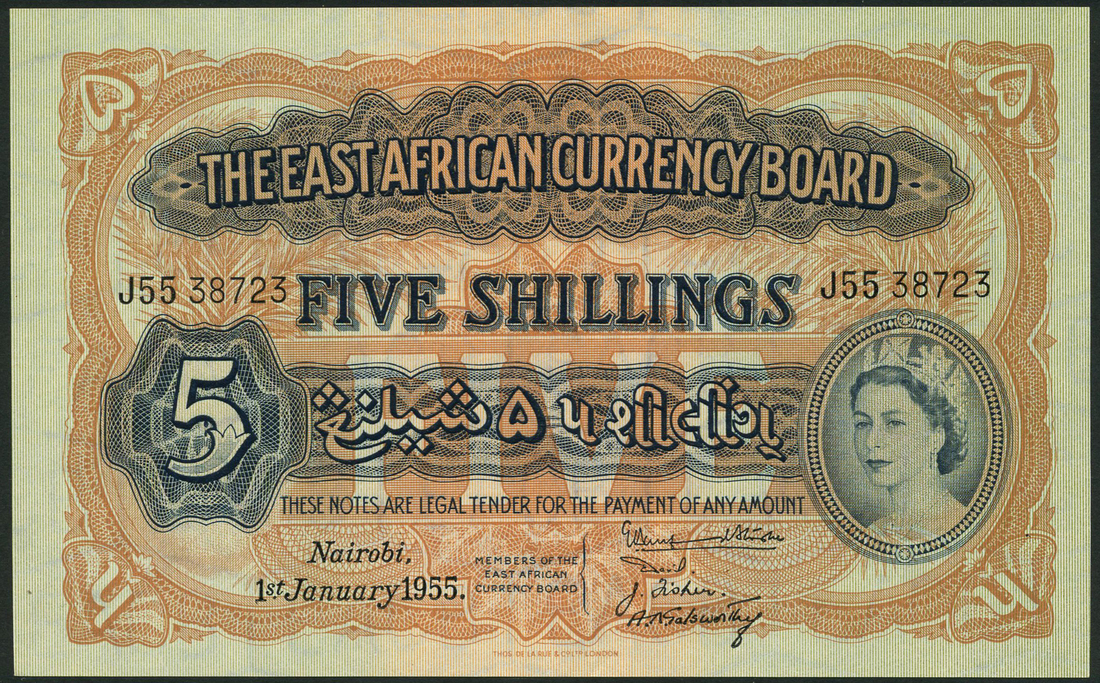 (x) East African Currency Board, 5 shillings (2), 1 January 1955, 1 October 1957, prefixes J/55 and L/83, black on orange-brown, value at centre, Elizabeth II at right, value at left and at each corner, reverse orange-brown, lion at centre