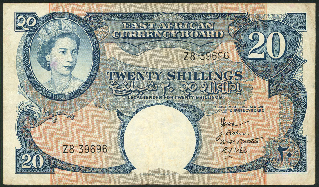 (x) East African Currency Board, 20 shillings, ND (1958), serial number Z8 39696, blue and pale lilac, Elizabeth II at top left, value at centre and at each corner, Savage, Fisher, Cunningham Mathieson and Vile signatures