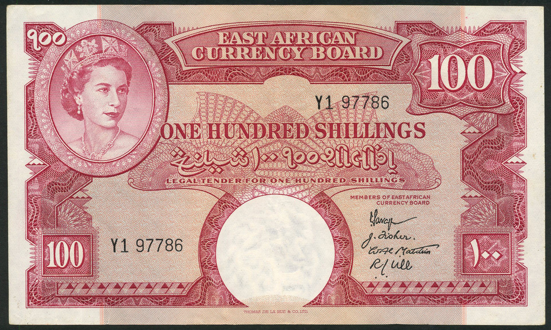 (x) East African Currency Board, 100 shillings, ND (1958), serial number Y1 97786, red and pale lilac, Elizabeth II at top left, value at centre and at each corner, Savage, Fisher, Cunningham Mathieson and Vile signatures, reverse red