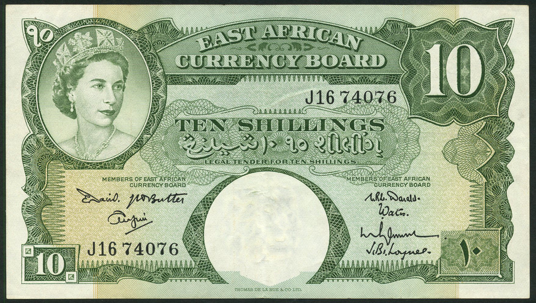 (x) East African Currency Board, 5 shillings, ND (1961), prefix L23, brown, Elizabeth II at top left, value at centre and at each corner, also 10 shillings, ND (1961), prefix J, green, design as previous, both David signature top left