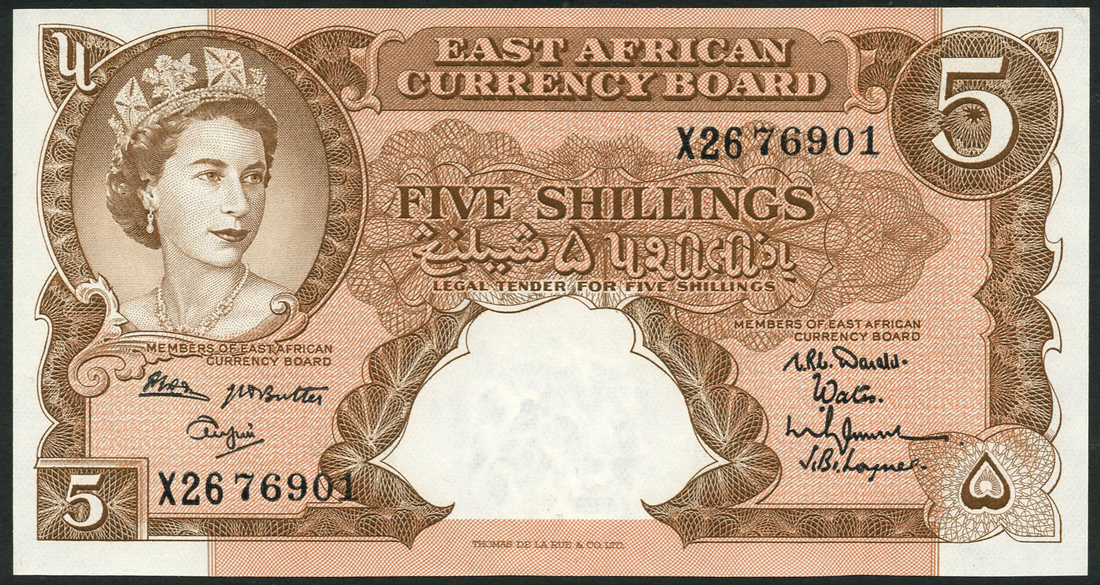 (x) East African Currency Board, 5 shillings, ND (1962), serial number X 2676901, red and pale lilac, Elizabeth II at top left, value at centre and at each corner, Adu signature top left