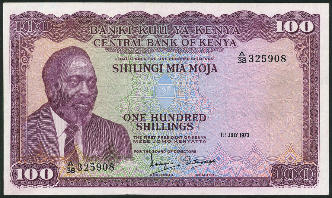 (x) Central Bank of Kenya, 100 shillings, 1 July 1973, serial number A/38 325908, purple and multicoloured, Jomo Kenyatta at left, Ndgewa and unknown signatures, reverse pineapple harvesting and Mount Kenya