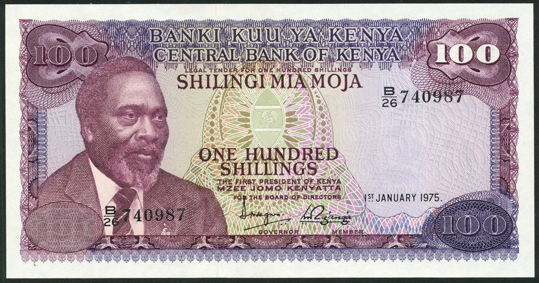 (x) Central Bank of Kenya, 100 shillings (4), 1974,1975,1976,1977, prefix B, purple, Jomo Kenyatta at left, signatures of Ndgewa and an unknown, reverse purple, the Kenyatta International Conference Centre