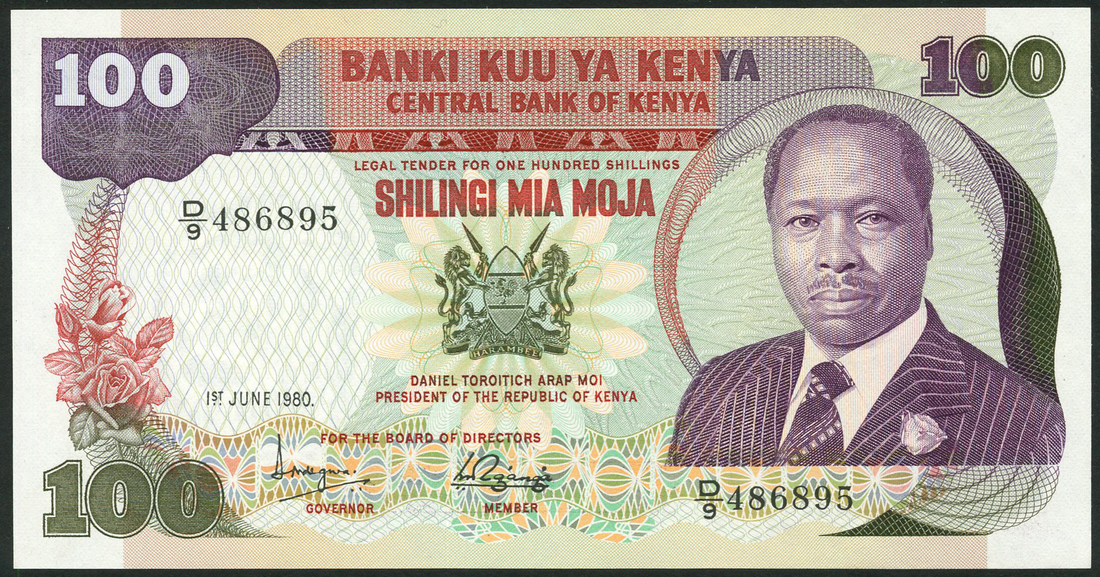 (x) Central Bank of Kenya, 50 shillings (5), 1980,1985,1986,1987,1988, purple and mauve, also 100 shillings (6), 1980,1981,1984,1986,1987,1988, violet and multicoloured, all Daniel Arap Moi at right