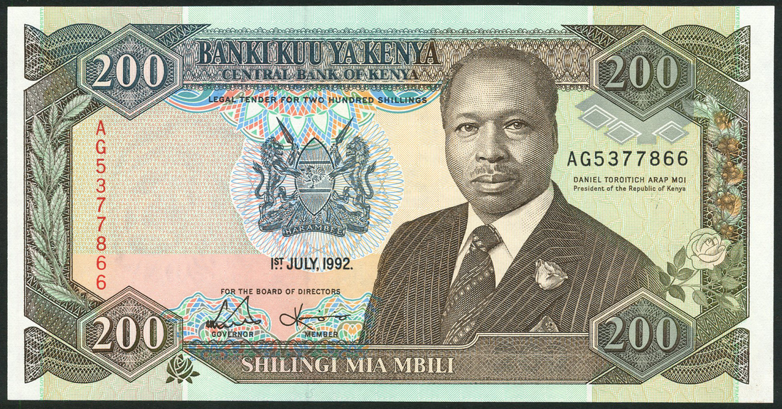 (x) Central Bank of Kenya, 200 shillings (6), 1989,1990,1992 (2),1993,1994, brown, green and multicoloured, Daniel Arap Moi at right, signatures Kotut-Mbindyo (2)/Kotut-Koinange (2)/Cheserem-Koinange (2) respectively