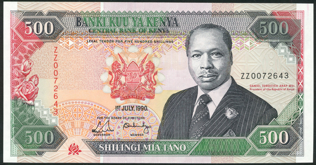 (x) Central Bank of Kenya, 500 shillings, 1 July 1990, serial number ZZ 0072643, black, red, green and multicoloured, Daniel Arap Moi at right, signatures of Kotut-Mbindyo